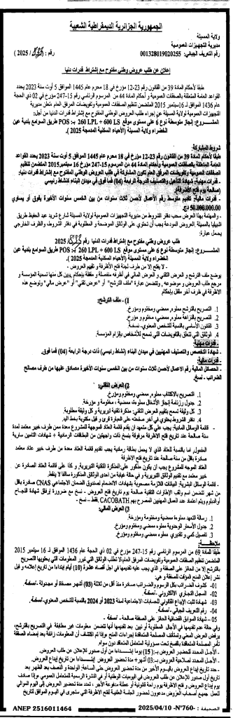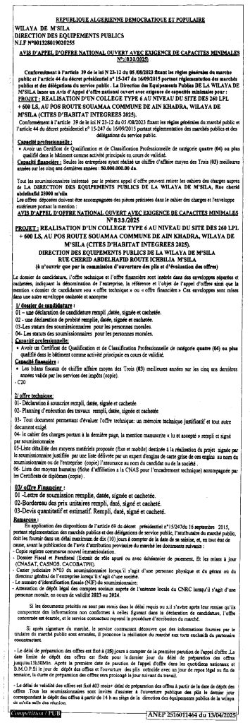 إعلان عن طلب وطني مفتوح انجاز متوسطة نوع 6 طريق السوامع بلدية عين الخضراء/ مديرية التجهيزات العمومية لولاية المسيلة