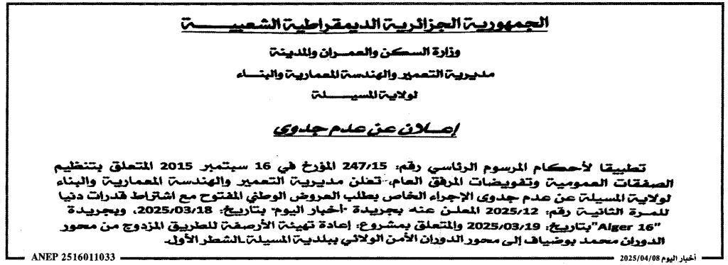 إعلان عن عدم جدوى إعادة تهيئة الأرصفة للطريق المزدوج/ مديرية التعمير والهندسة المعمارية والبناء لولاية المسيلة