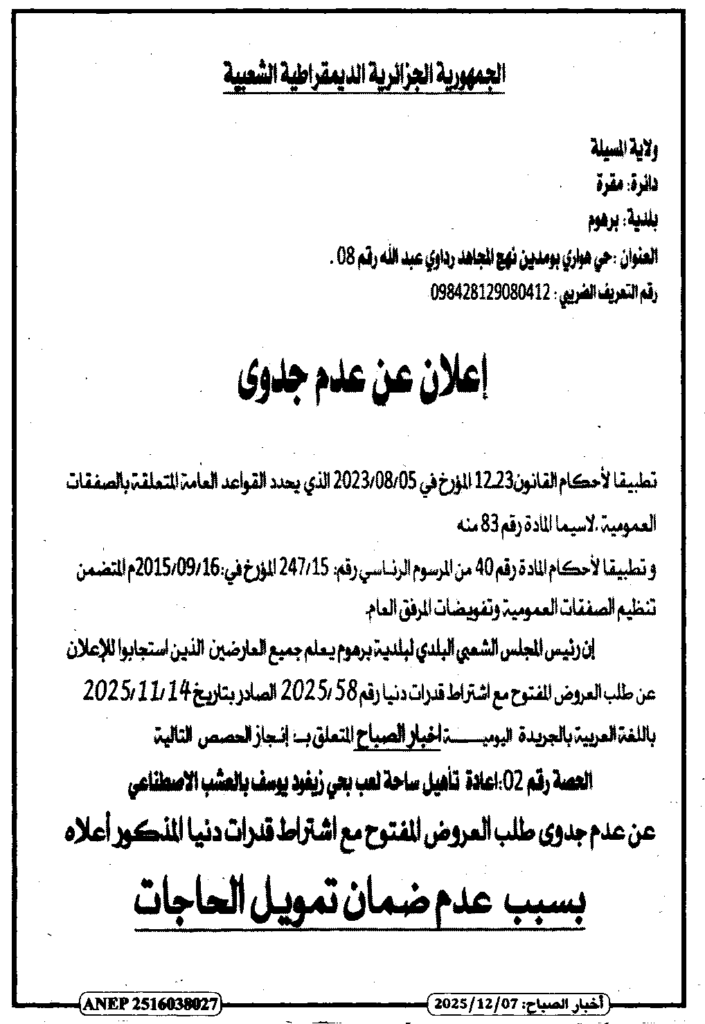 إعلان عن عدم جدوى اعادة تأهيل ساحة لعب/ بلدية برهوم