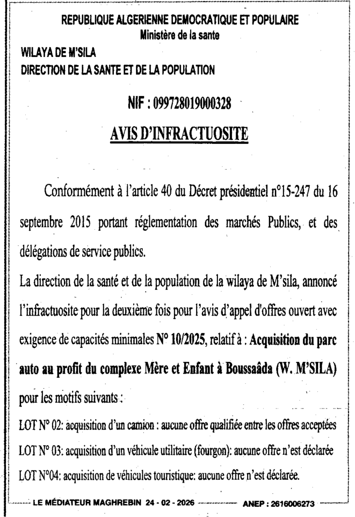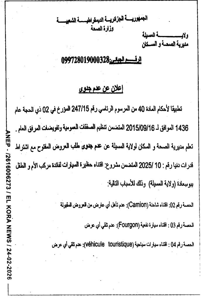 إعلان عن عدم جدوى اقتناء حضيرة السيارات لفائدة مركب الطفل والأم ببوسعادة/ مديرية الصحة والسكان لولاية المسيلة