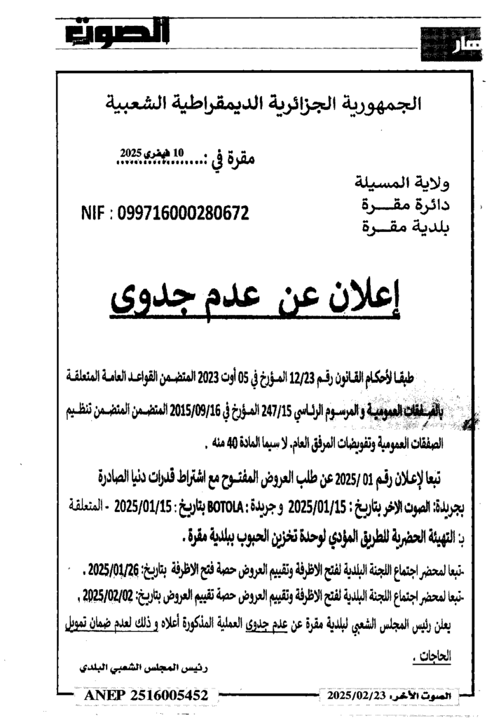 إعلان عن عدم جدوى التهيئة الحضرية للطريق المؤدي لوحدة تخزين الحبوب ببلدية مقرة