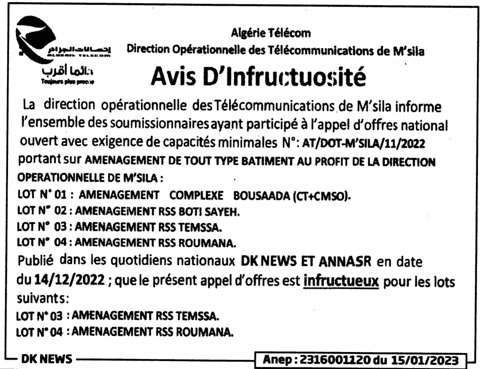 إعلان عن عدم جدوى/ المديرية الولائية لاتصالات الجزائر