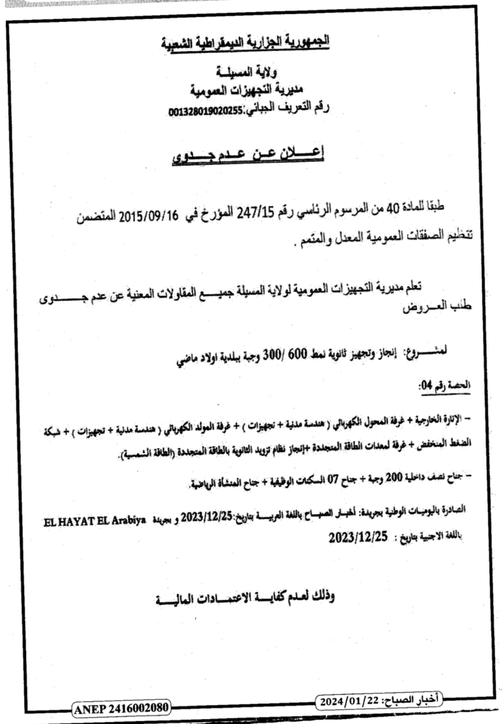 إعلان عن عدم جدوى: انجاز وتجهيز ثانوية نمط 300/600 وجبة ببلدية أولاد ماضي مديرية التجهيزات العمومية