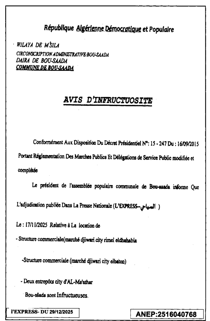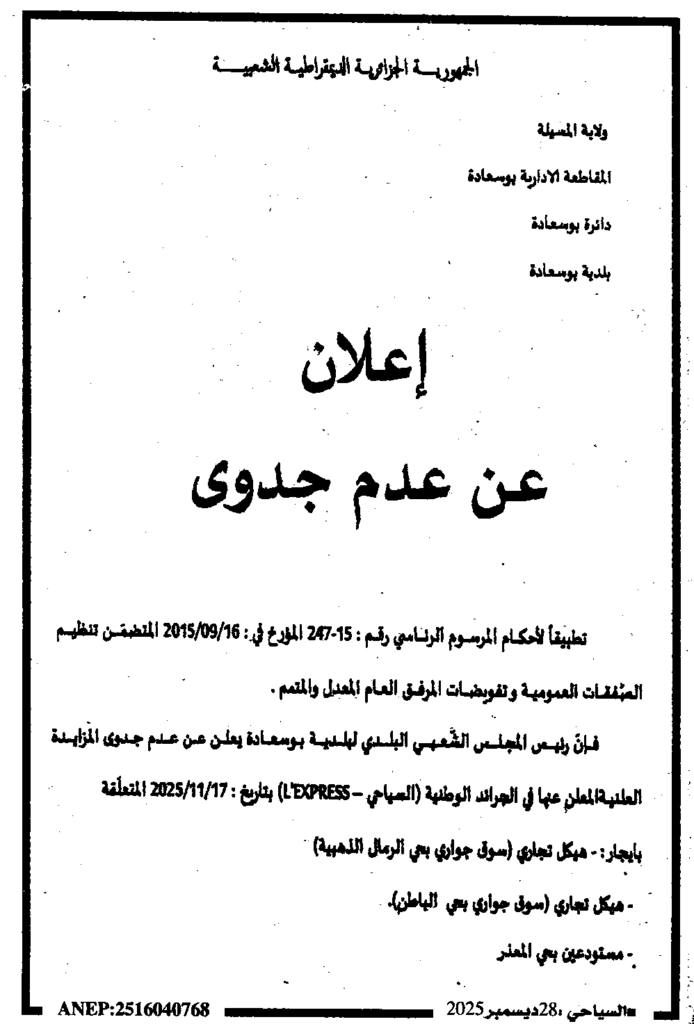 إعلان عن عدم جدوى ايجار هيكل تجاري/ بلدية بوسعادة