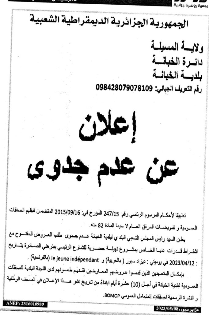 إعلان عن عدم جدوى/ بلدية الخبانة