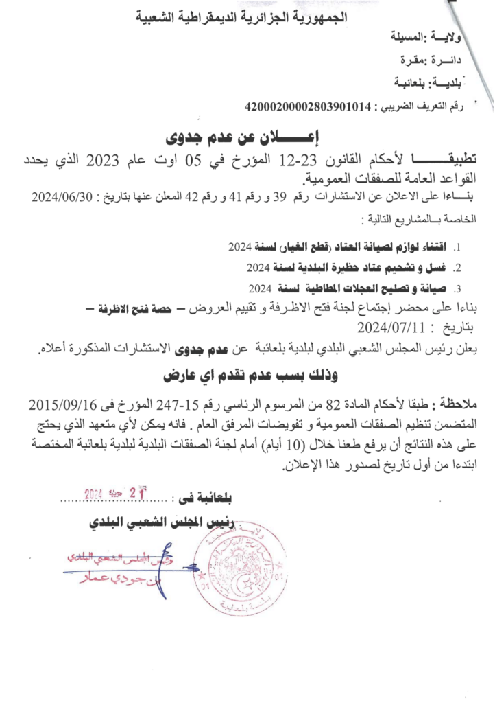 إعلان عن عدم جدوى/ بلدية بلعايبة