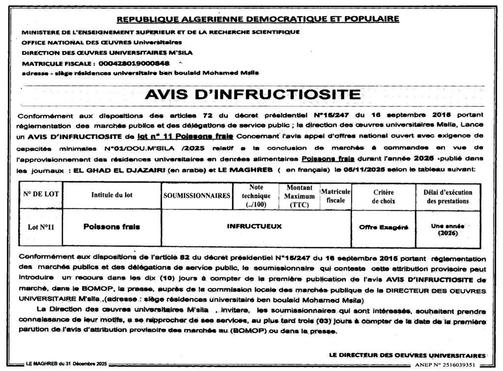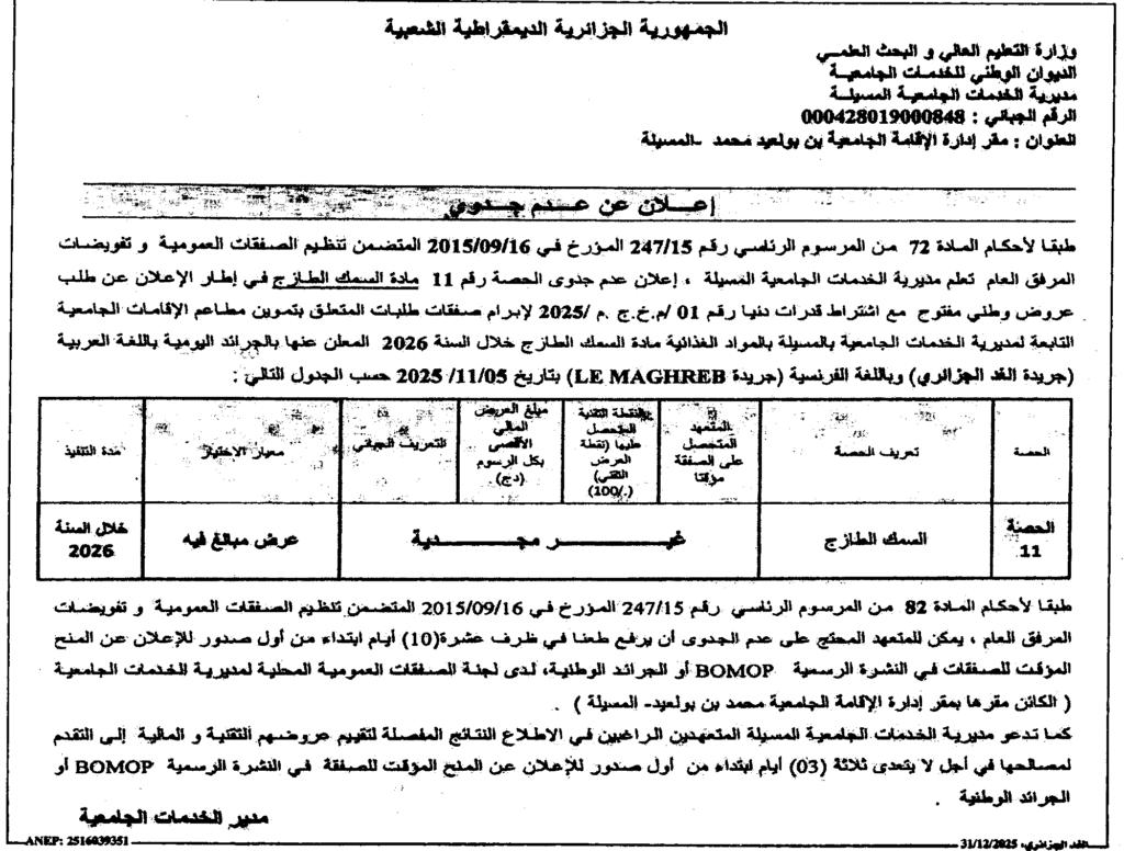 إعلان عن عدم جدوى تموين مطاعم الإقانات الجامعية بالمواد الغذائية مادة السمك الطازج 2026 / مديرية الخدمات الجامعية المسيلة