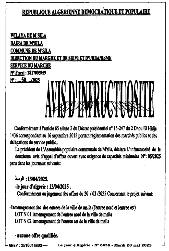 إعلان عن عدم جدوى تهيئة مداخل مدينة المسيلة/ بلدية المسيلة