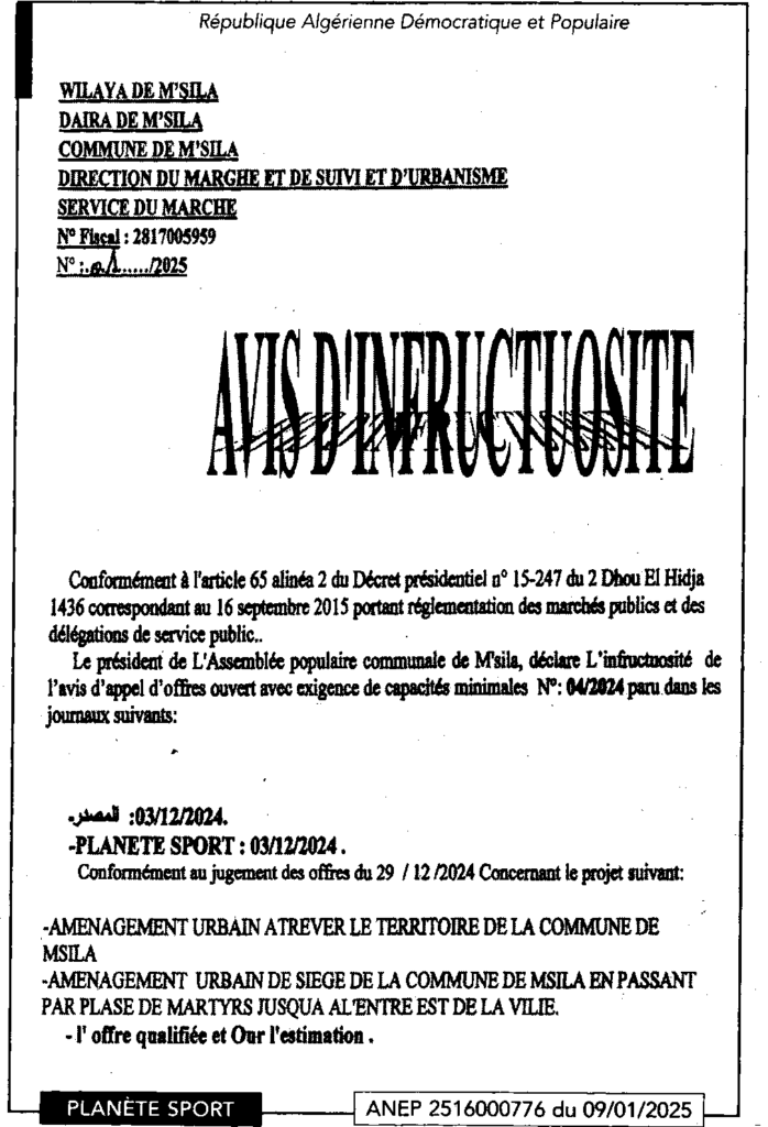 إعلان عن عدم جدوى خاصة بمشروع تهيئة حضرية عبر إقليم ولاية المسيلة/ بلدية المسيلة