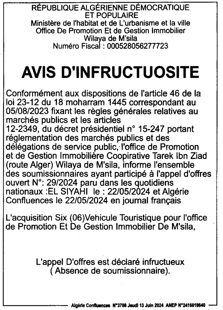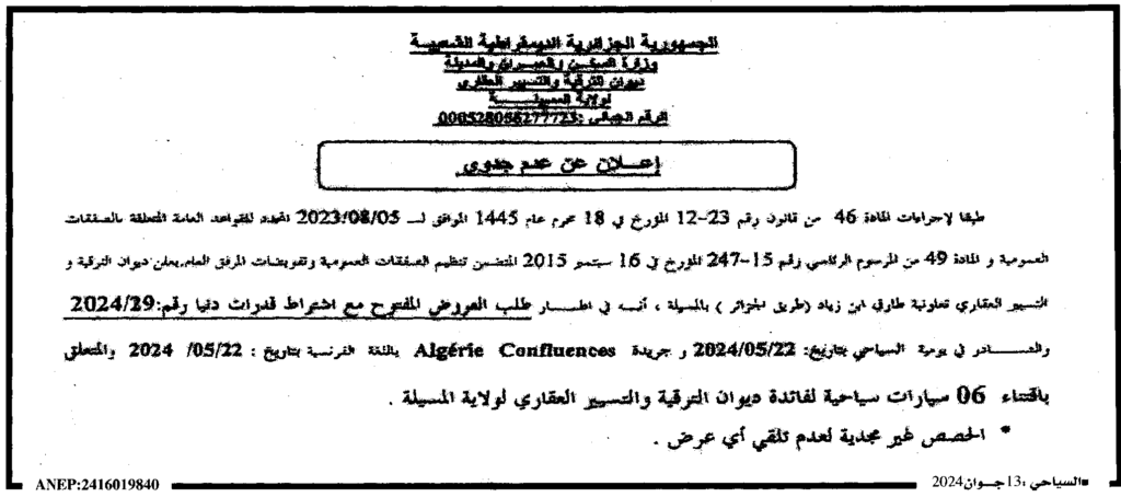 إعلان عن عدم جدوى/ ديوان الترقية والتسيير العقاري لولاية المسيلة
