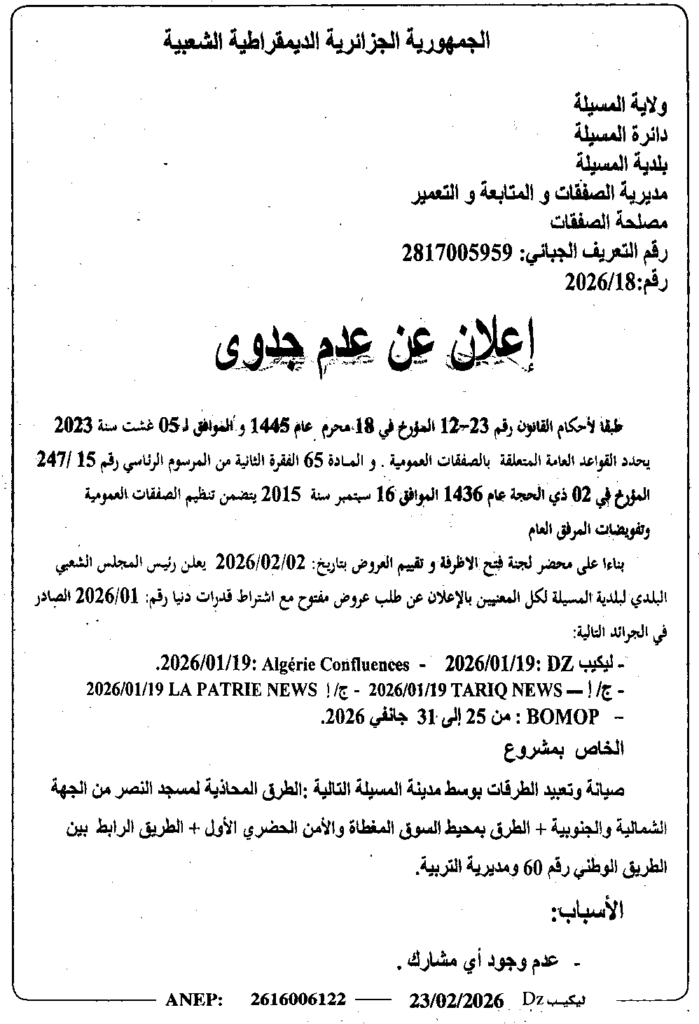 إعلان عن عدم جدوى صيانة وتعبيد الطرقات بوسط مدينة المسيلة/ بلدية المسيلة