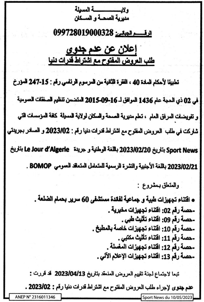إعلان عن عدم جدوى طلب العروض المفتوح/ مديرية الصحة والسكان لولاية المسيلة