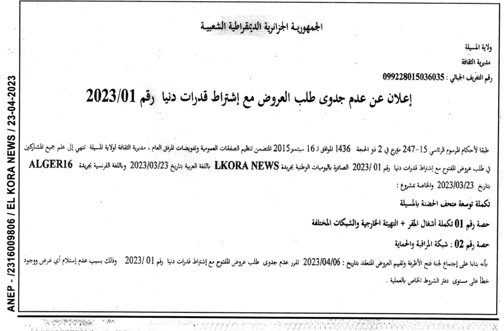 إعلان عن عدم جدوى طلب العروض 2023/01 مديرية الثقافة لولاية المسيلة