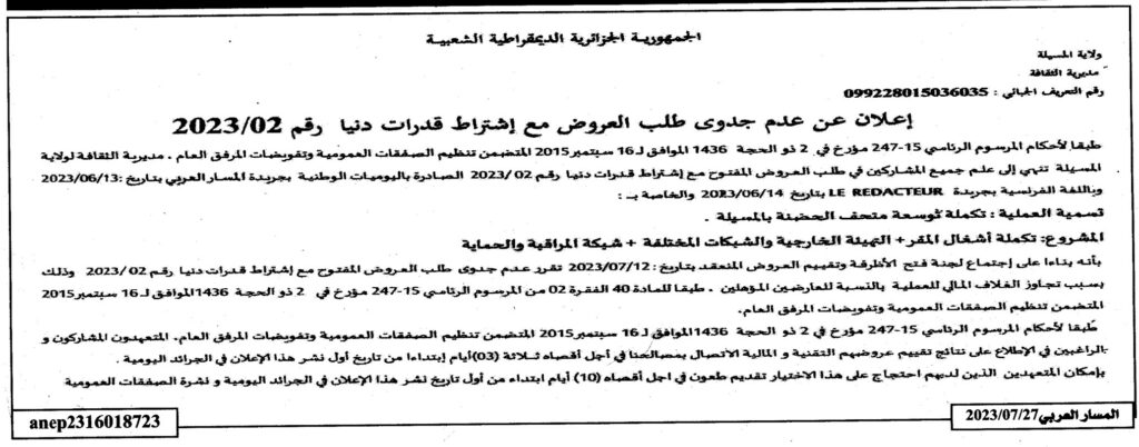 إعلان عن عدم جدوى طلب العروض 2023/02 مديرية الثقافة لولاية المسيلة
