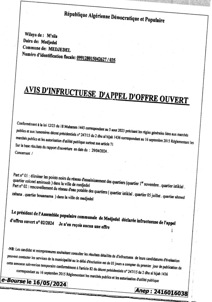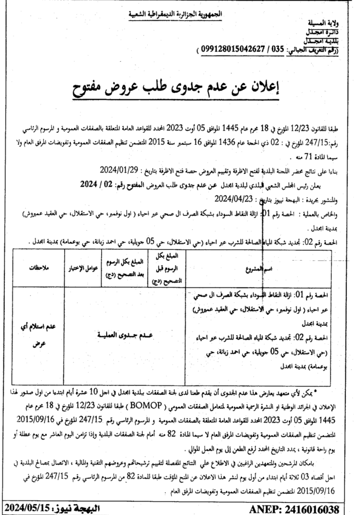إعلان عن عدم جدوى طلب عروض مفتوح/ بلدية امجدل