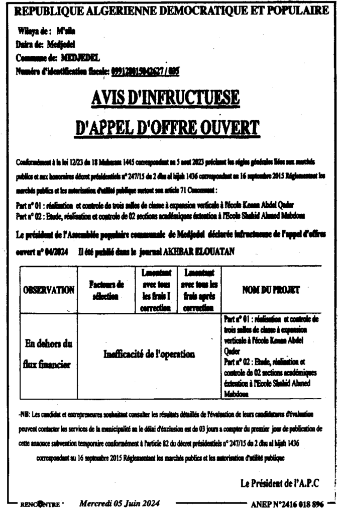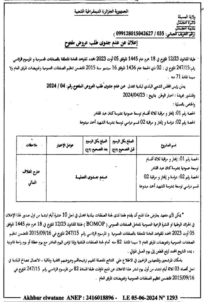 إعلان عن عدم جدوى طلب عروض مفتوح/ بلدية امجدل