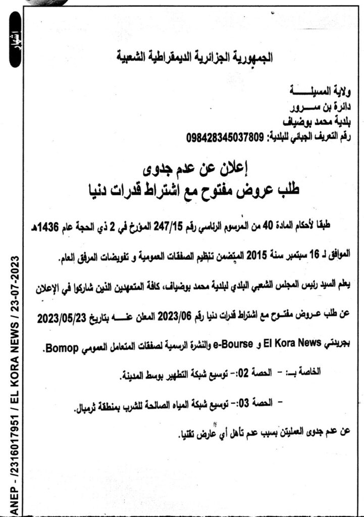 إعلان عن عدم جدوى طلب عروض مفتوح/ بلدية محمد بوضياف