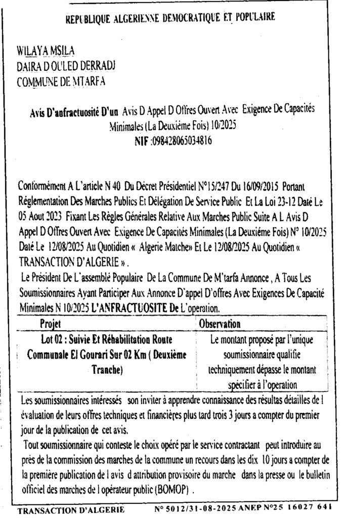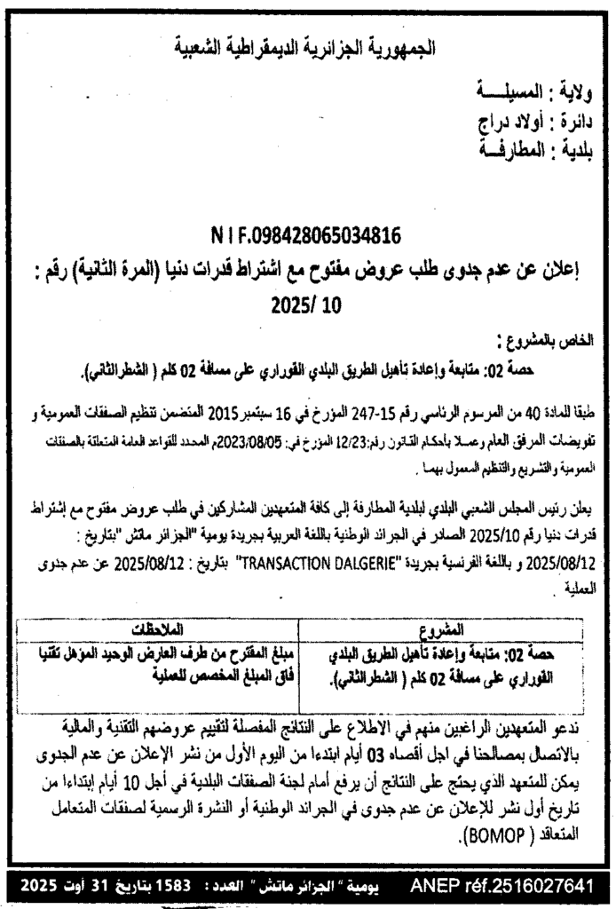 إعلان عن عدم جدوى طلب عروض مفتوح 2025/10 لمتابعة وتأهيل الطريق البلدي القوراري على مسافة 02 كلم/ بلدية المطارفة