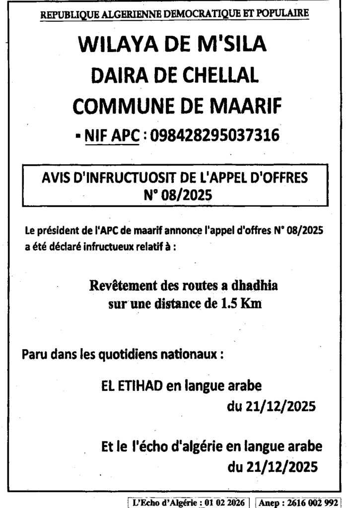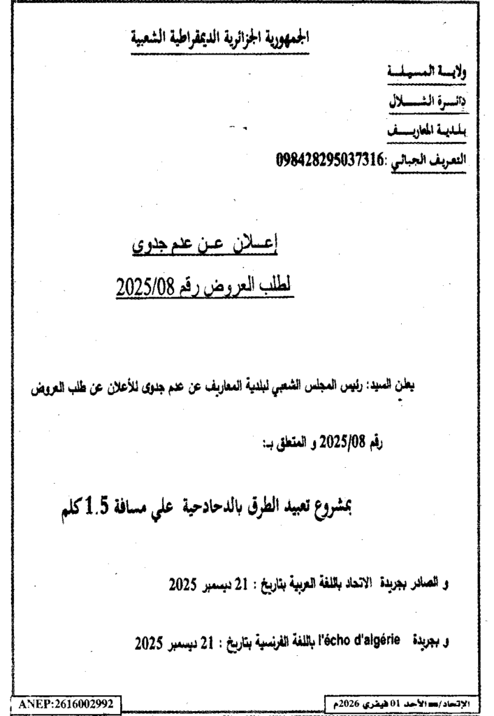 إعلان عن عدم جدوى لطلب العروض 2025/08 بلدية المعاريف