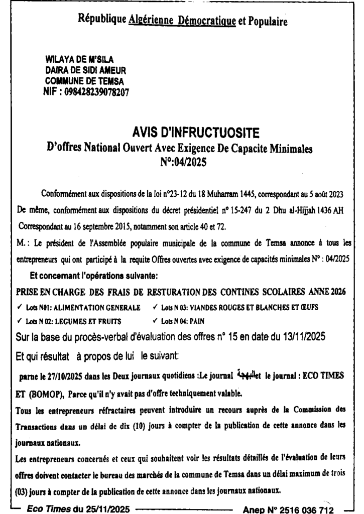 إعلان عن عدم جدوى لطلب عروض مفتوح 2025/04 بلدية تامسة