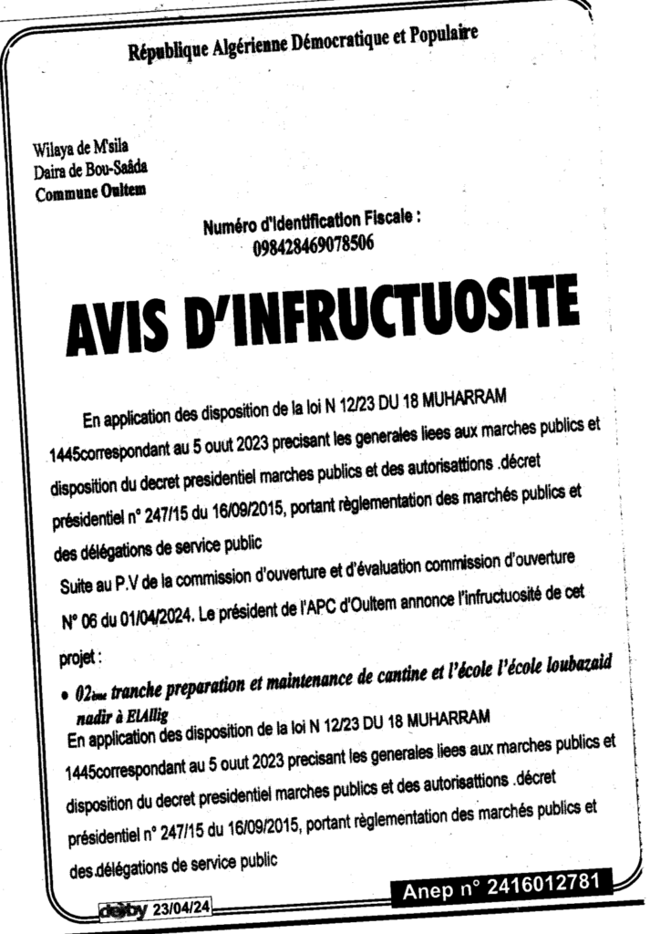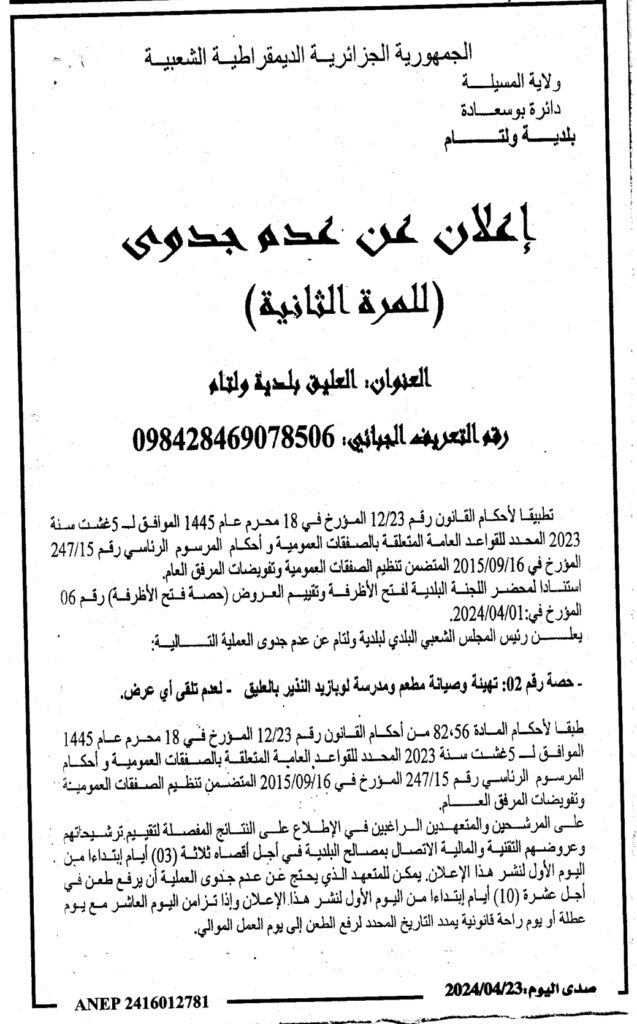 إعلان عن عدم جدوى للمرة الثانية: تهيئة وصيانة مطعم ومدرسة لوبازيد النذير بالعليق بلدية ولتام