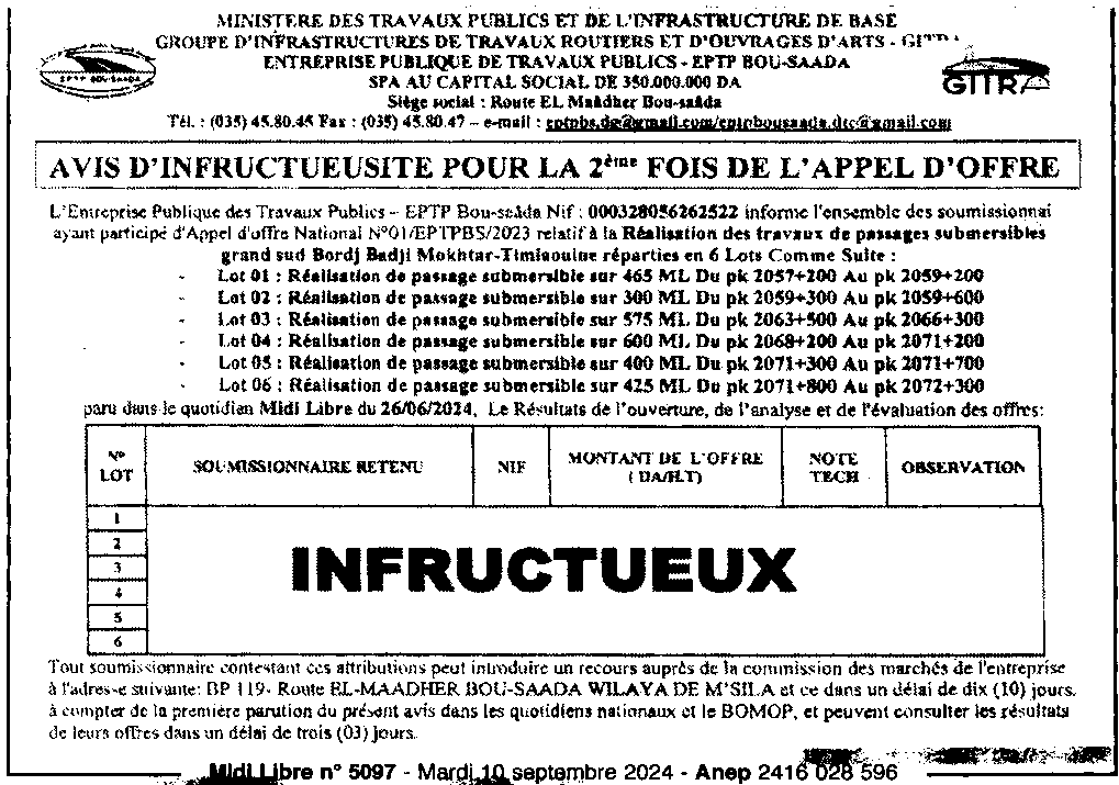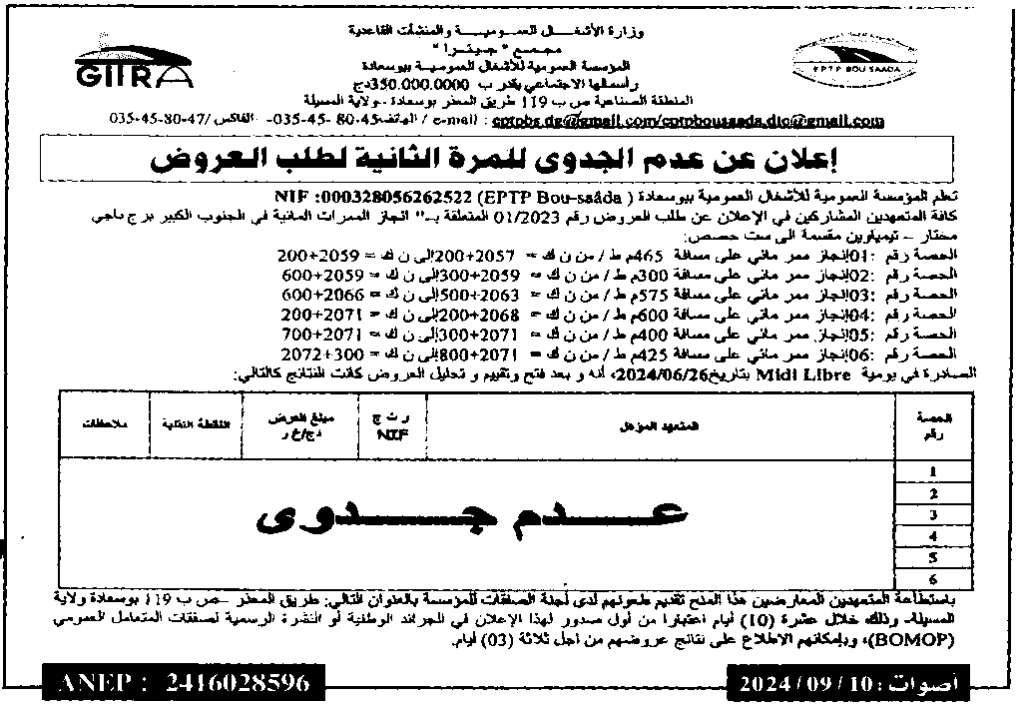إعلان عن عدم جدوى للمرة الثانية لطلب العروض/ المؤسسة العمومية للأشغال العمومية ببوسعادة