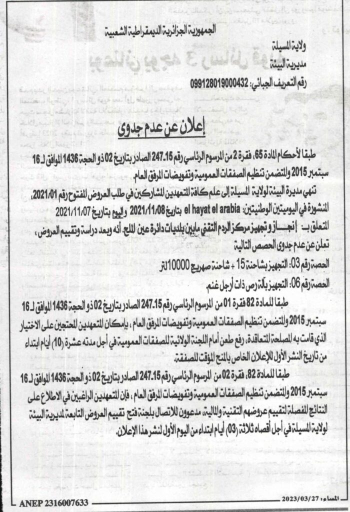 إعلان عن عدم جدوى/ مديرية البيئة