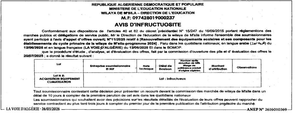 إعلان عن عدم جدوى/ مديرية التربية لولاية المسيلة