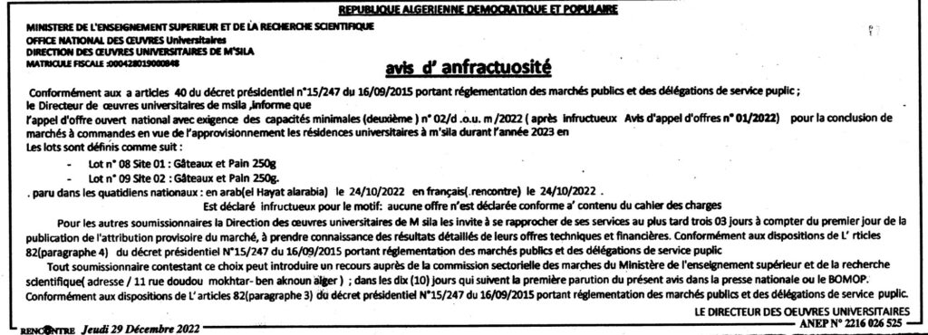 إعلان عن عدم جدوى مديرية الخدمات الجامعية بالمسيلة