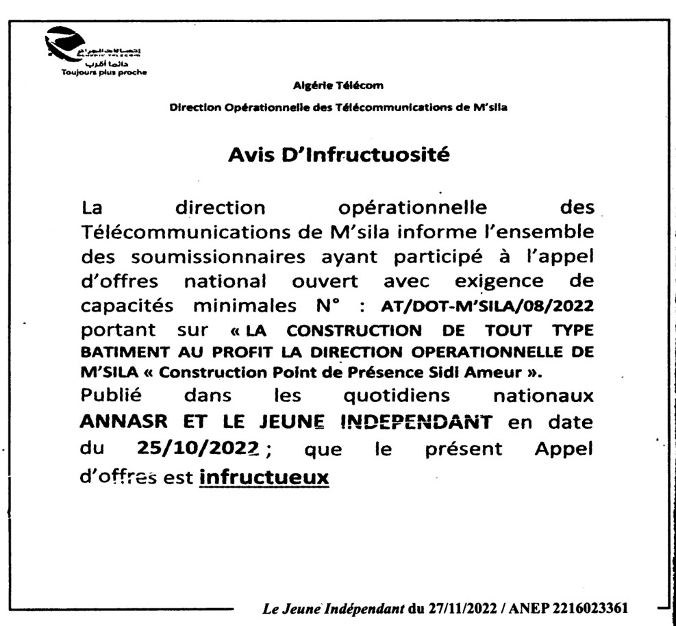 إعلان عن عدم جدوى/ مديرية الوحدة الولائية اتصالات الجزائر