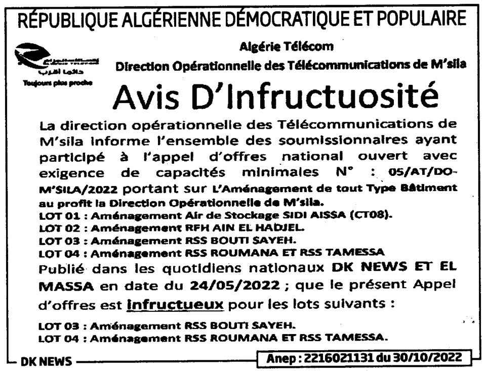 إعلان عن عدم جدوى مديرية الوحدة الولائية اتصالات الجزائر