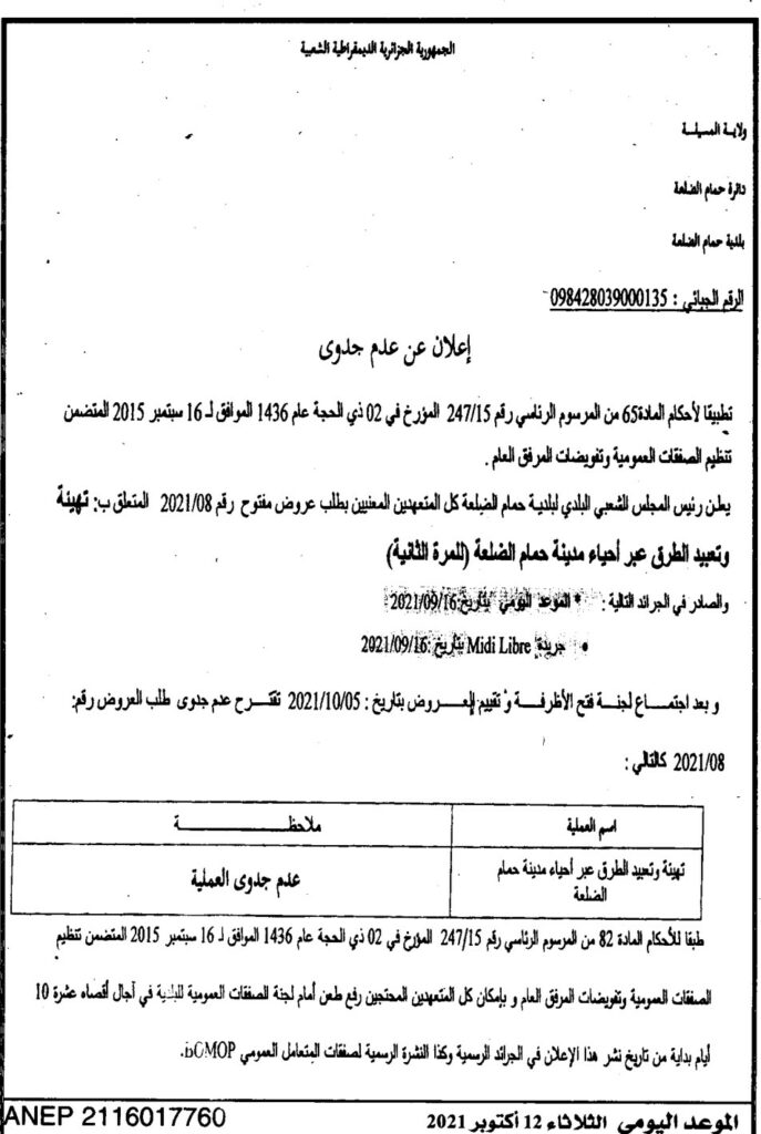 إعلان عن عدم جدوى طلب العروض المتعلق بــ : تهيئة وتعبيد الطرق عبر أحياء مدينة حمام الضلعة (للمرة الثانية)24 أكتوبر، 20210 8 شاركها فيسبوك X مشاركة عبر البريد طباعة