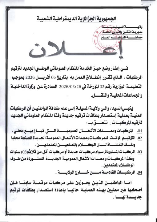 إعلان عن عملية استصدار بطاقات ترقيم جديدة للمركبات