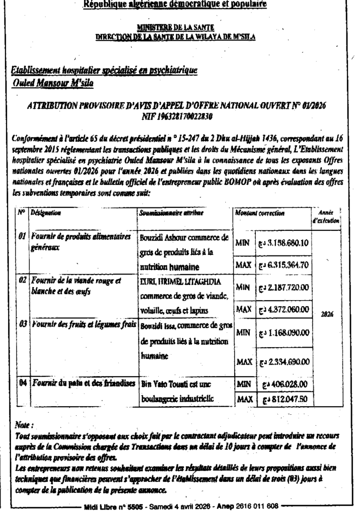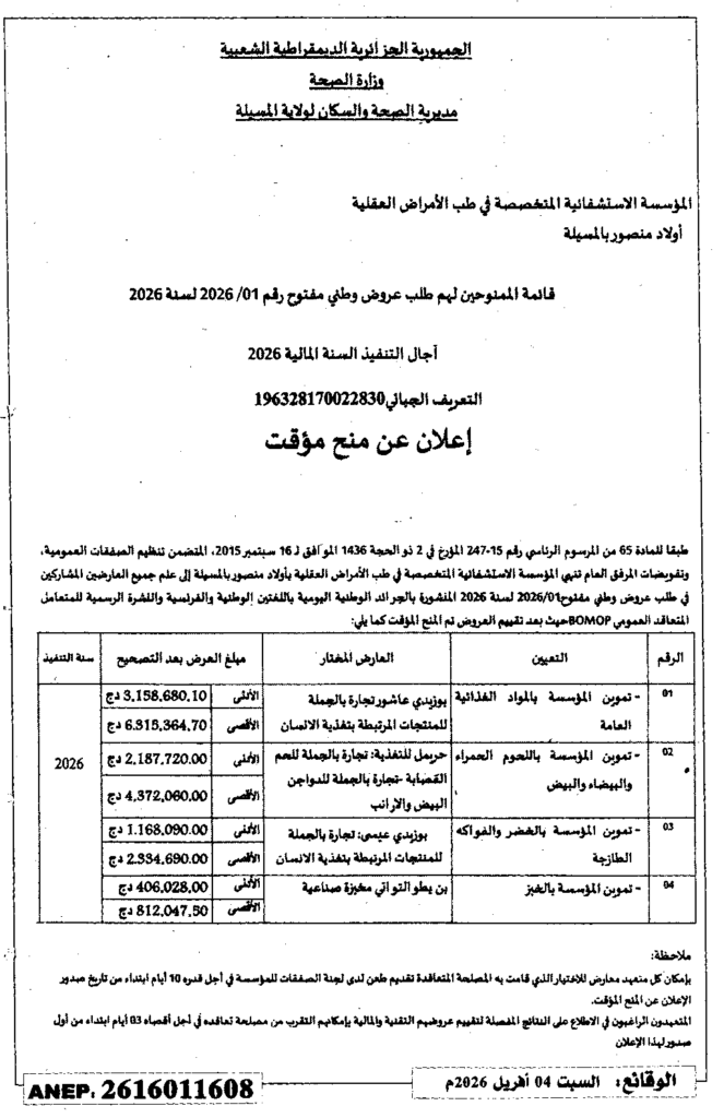 إعلان عن قائمة الممنوحين لهم طلب عروض وطني مفتوح 2026/01 المؤسسة الاستشفائية المتخصصة في طب الأمراض العقلية بأولاد منصور بالمسيلة