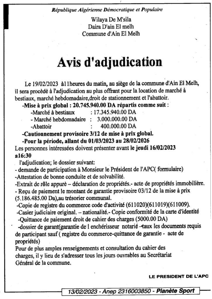 إعلان عن مزاد علني لكراء حقوق الأسواق والمذبح البلدي ببلدية عين الملح