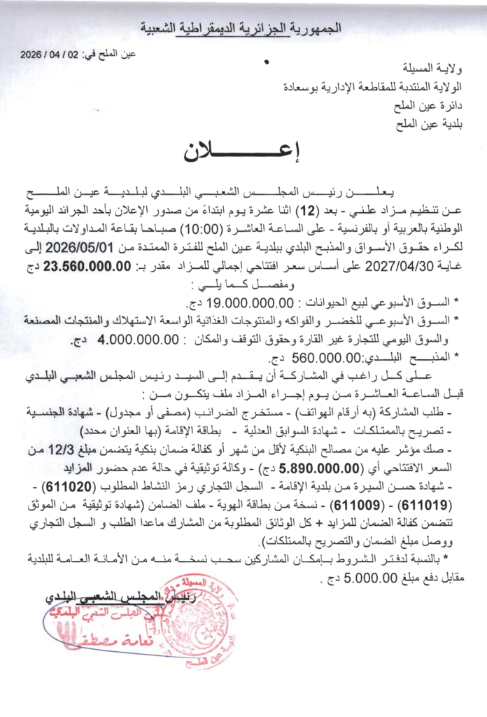 إعلان عن مزاد علني لكراء حقوق الأسواق والمذبح البلدي/ بلدية عين الملح