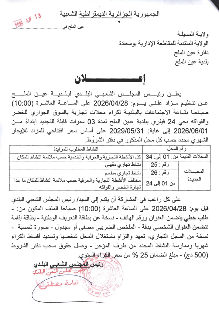 إعلان عن مزاد علني لكراء محلات تجارية بالسوق الجواري للخضر والفواكه ببلدية عين الملح