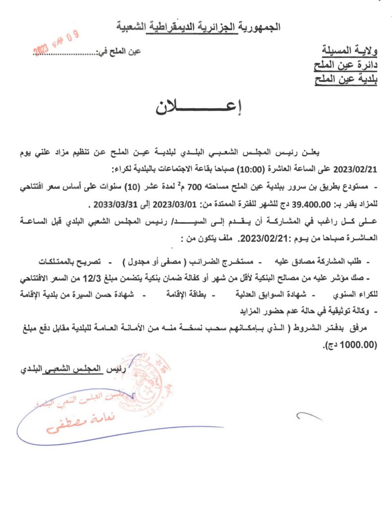 إعلان عن مزاد علني لكراء مستودع بطريق بن سرور ببلدية عين الملح