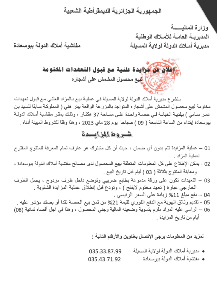 إعلان عن مزايدة علنية مع قبول التعهدات المختومة لبيع محصول المشمش على اشجاره
