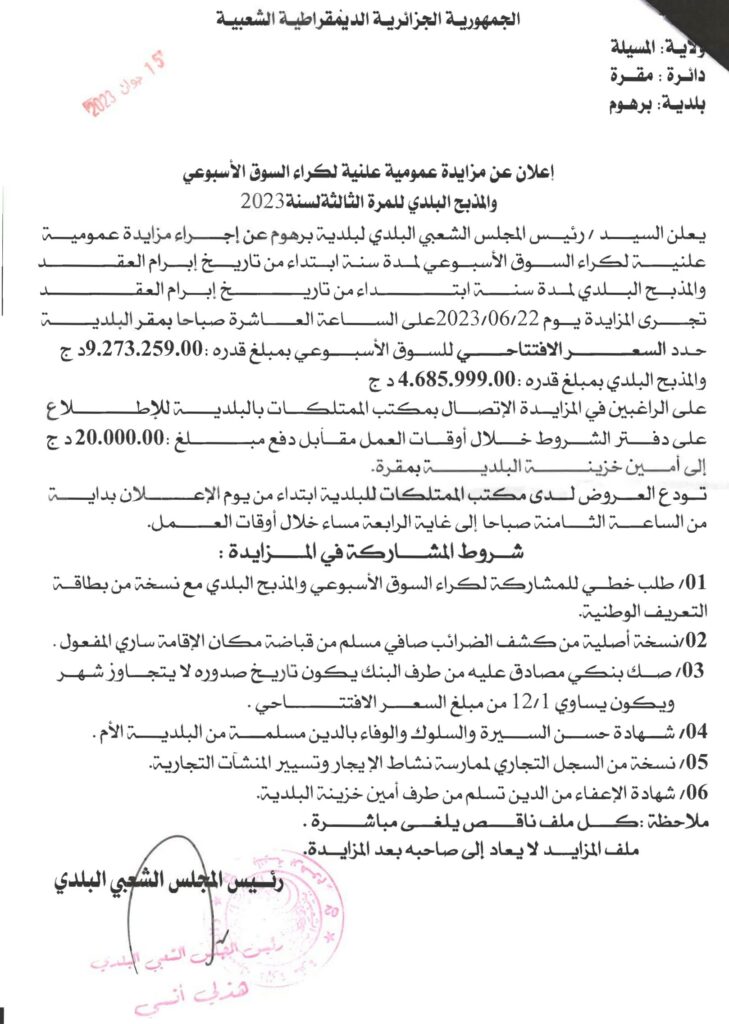 إعلان عن مزايدة عمومية علنية لكراء السوق الأسبوعي والمذبح البلدي للمرة الثانية لسنة 2023 بلدية برهوم