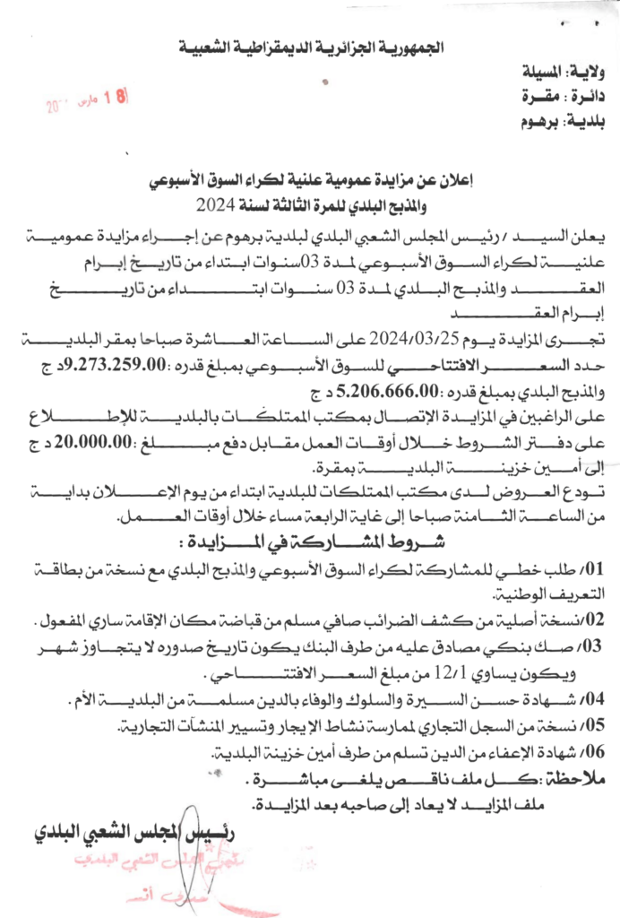 إعلان عن مزايدة عمومية علنية لكراء السوق الأسبوعي والمذبح البلدي للمرة الثالثة لسنة 2024/ بلدية برهوم