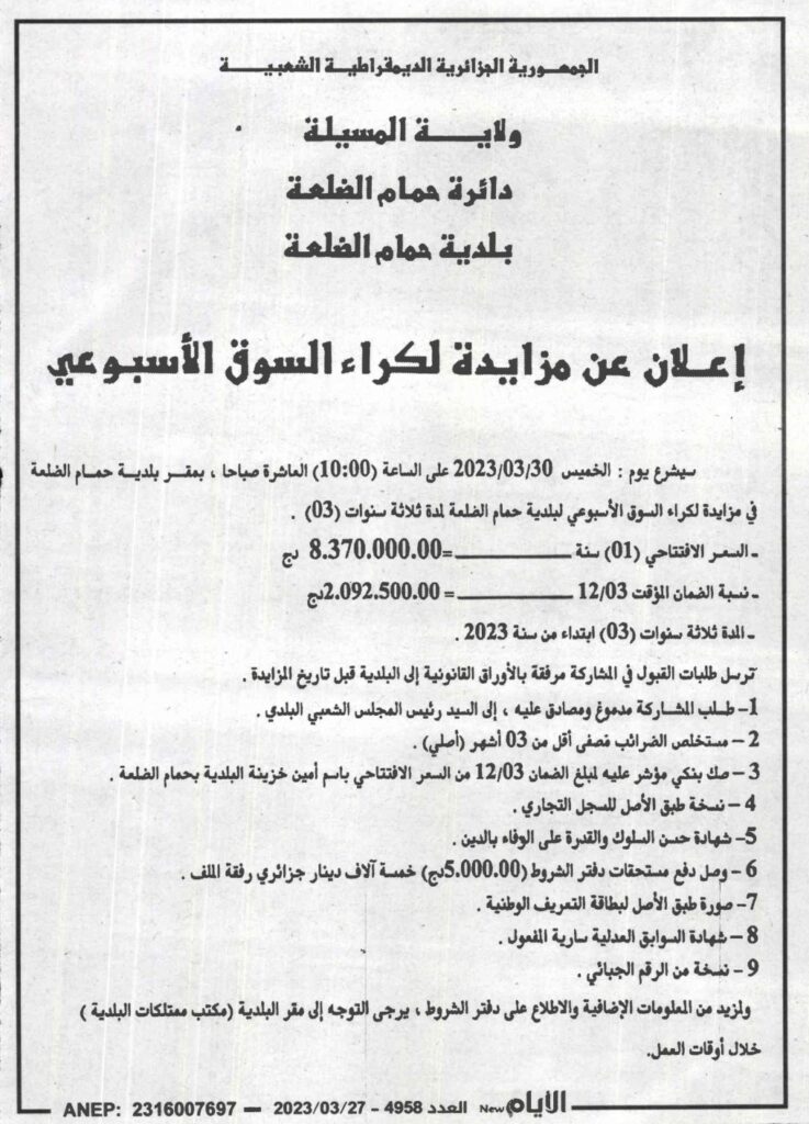إعلان عن مزايدة لكراء السوق الأسبوعي/ بلدية حمام الضلعة
