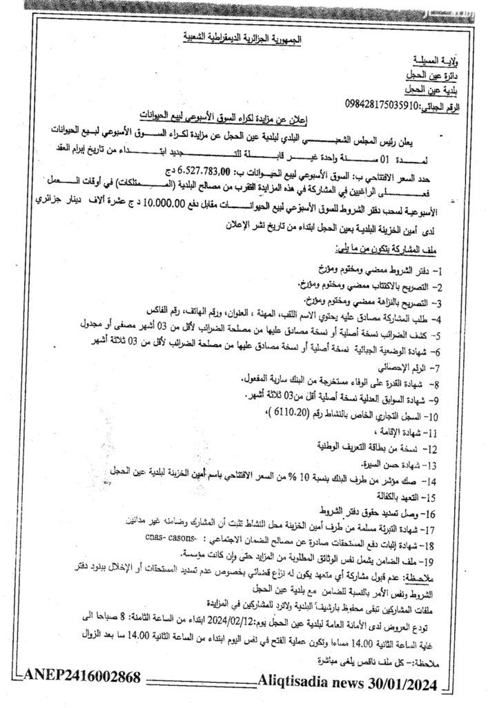 إعلان عن مزايدة لكراء السوق الأسبوعي لبيع الحيوانات/ بلدية عين الحجل
