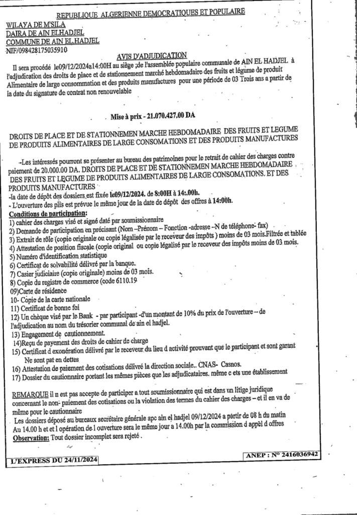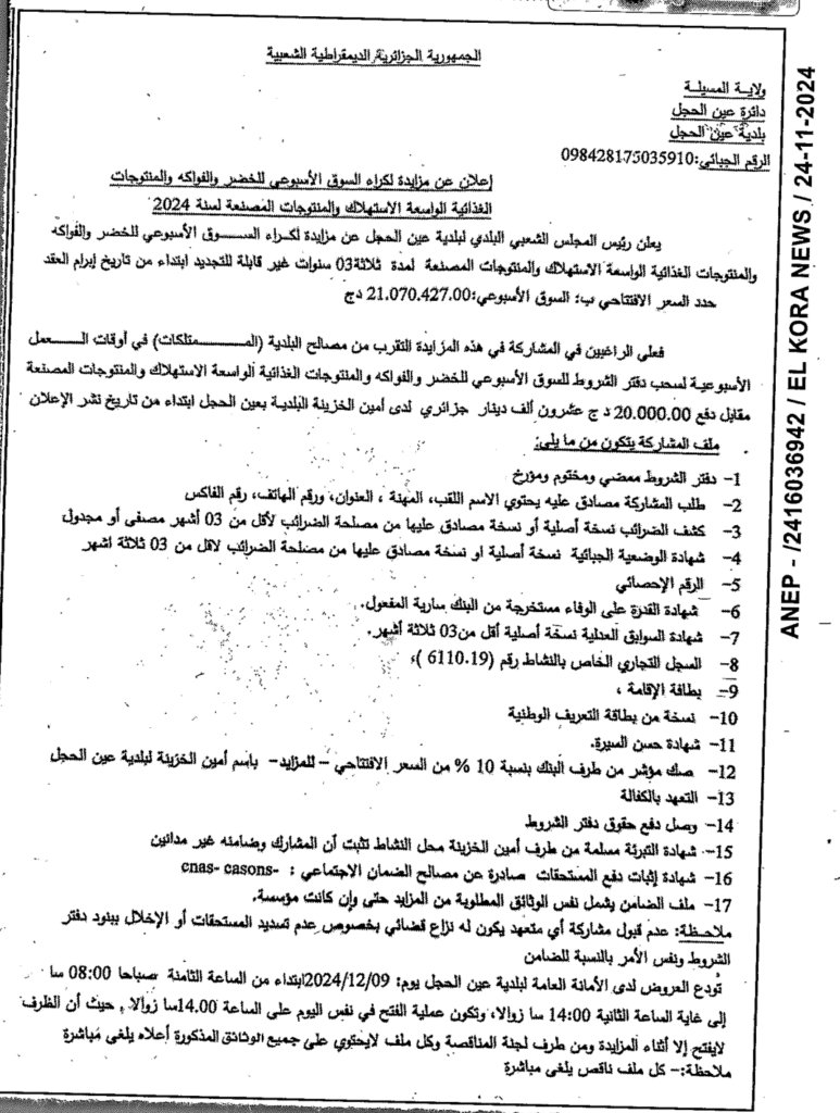 إعلان عن مزايدة لكراء السوق الأسبوعي للخضر والفواكه والمنتوجات الغذائية الواسعة الاستهلاك والمنتوجات المصنعة لسنة 2024/ بلدية عين الحجل