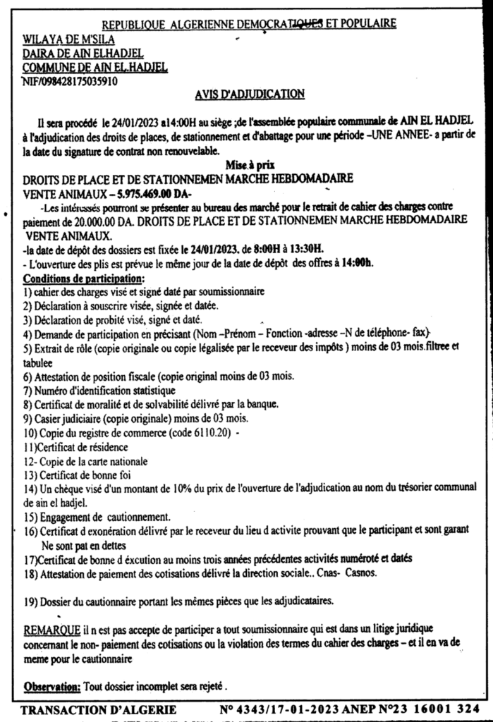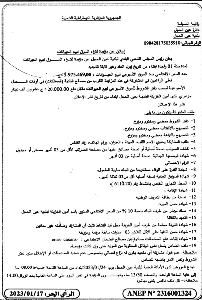 إعلان عن مزايدة لكراء السوق لبيع الحيوانات/ بلدية عين الحجل