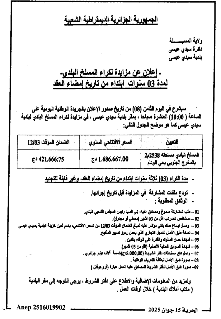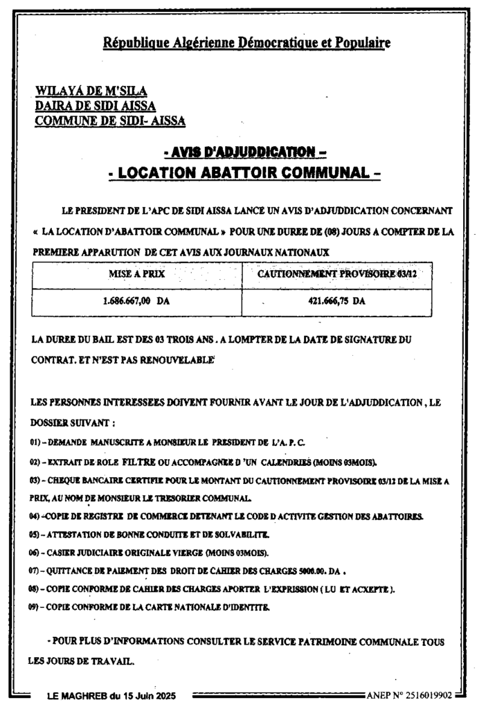 إعلان عن مزايدة لكراء المسلخ البلدي لمدة 03 سنوات بلدية سيدي عيسى