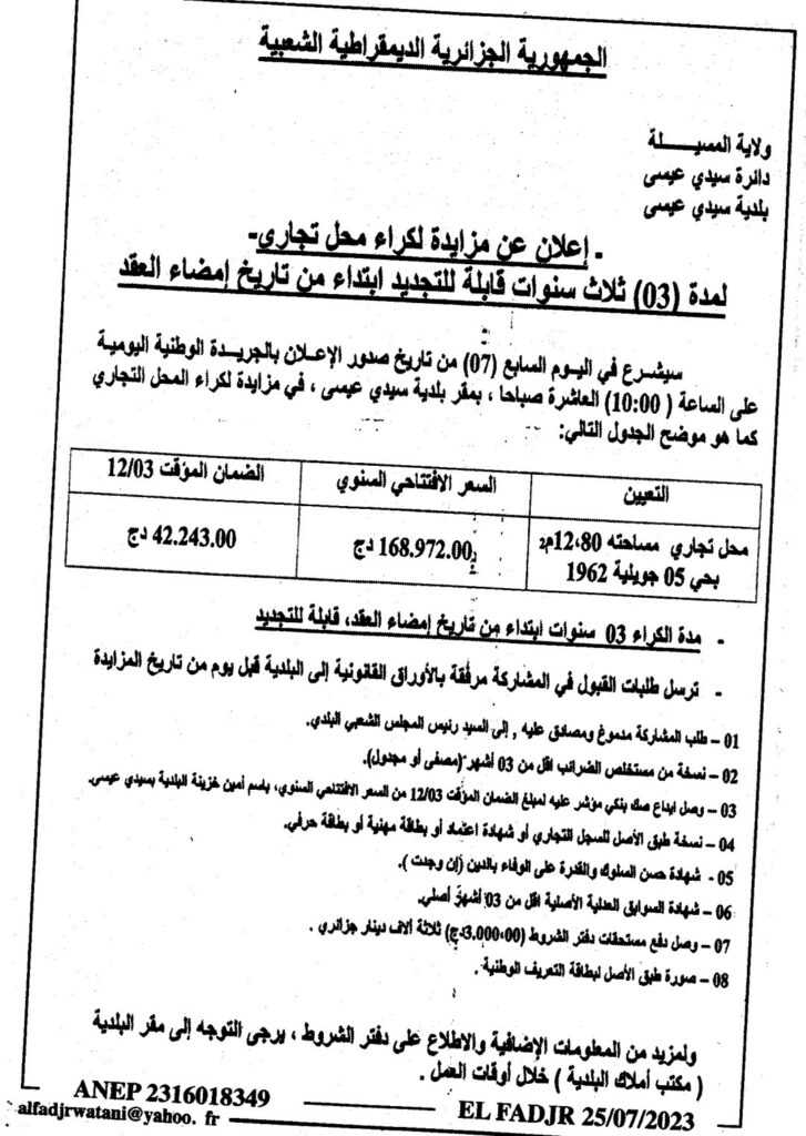 إعلان عن مزايدة لكراء محل تجاري لمدة (03) سنوات قابلة للتجديد ابتداء من تاريخ إمضاء العقد/ بلدية سيدي عيسى