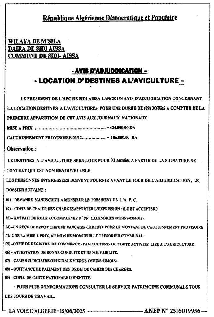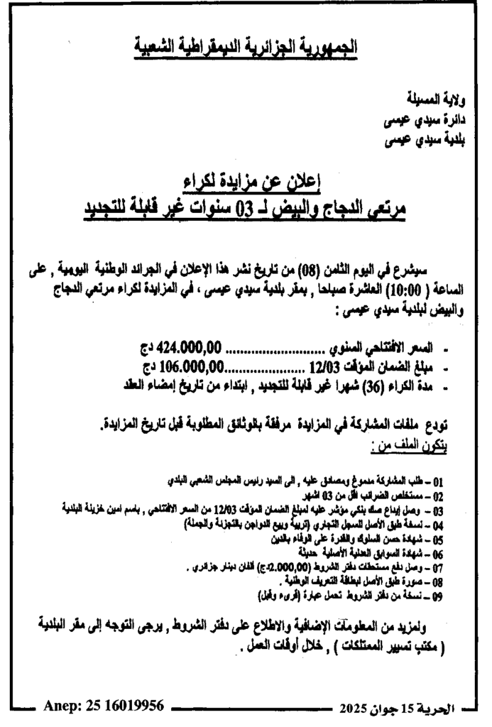 إعلان عن مزايدة لكراء مرتعي الدجاج والبيض لمدة 03 سنوات غير قابلة للتجديد/ بلدية سيدي عيسى