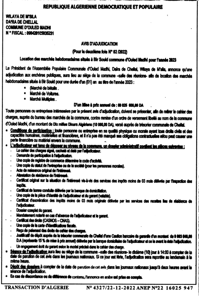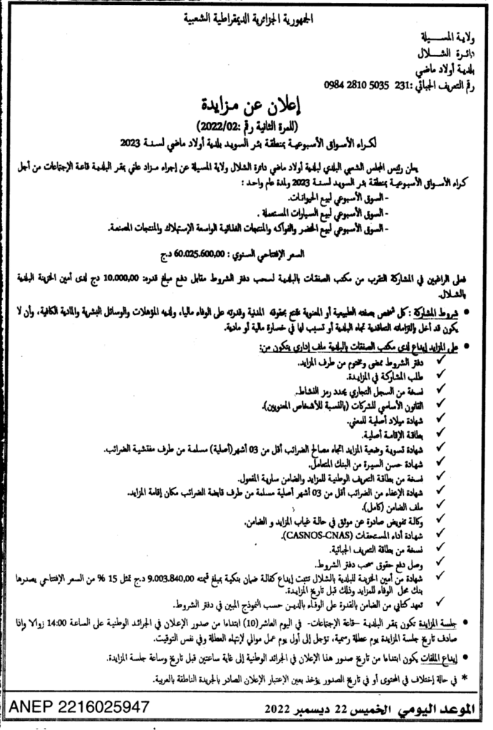 إعلان عن مزايدة للمرة الثانية 2022/02 بلدية أولاد ماضي