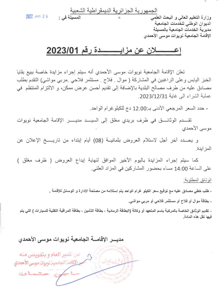 تعلن الإقامة الجامعية نويوات موسى الأحمدي أنه سيتم إجراء مزايدة خاصة ببيع بقايا الخبز اليابس28 ديسمبر، 20220 62 شاركها فيسبوك X مشاركة عبر البريد طباعة